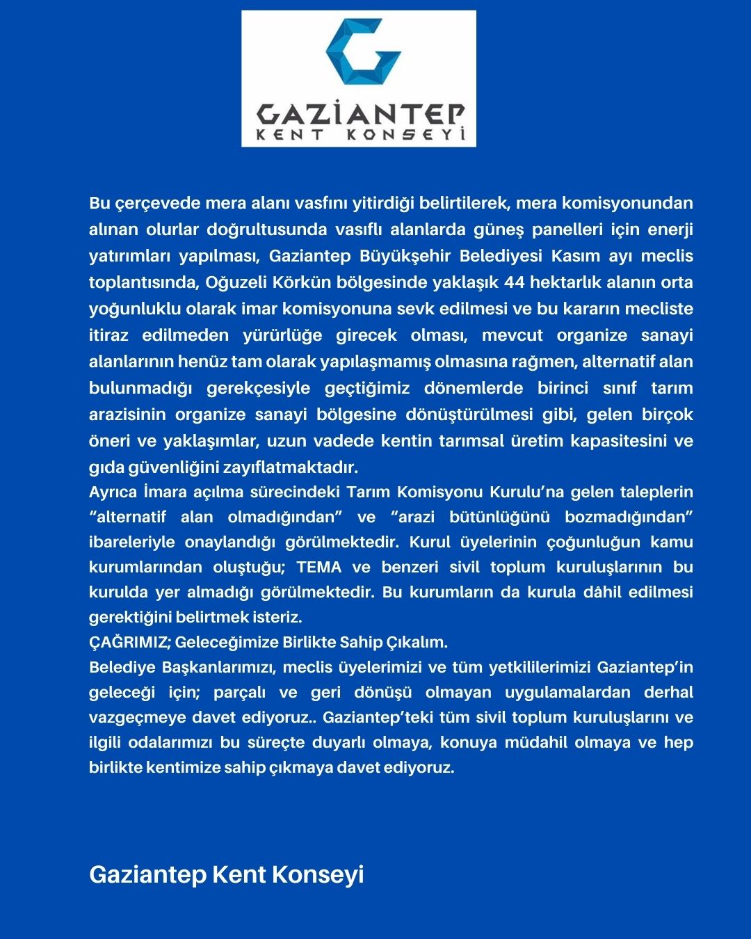 Belediye Başkanlarımızı, meclis üyelerimizi ve tüm yetkililerimizi Gaziantep’in geleceği için; Parçalı ve geri dönüşü olmayan uygulamalardan derhâl vazgeçmeye davet ediyoruz.. Gaziantep’teki tüm sivil toplum kuruluşlarını ve ilgili odalarımızı bu süreçte duyarlı olmaya, konuya müdahil olmaya ve hep birlikte kentimize sahip çıkmaya davet ediyoruz.